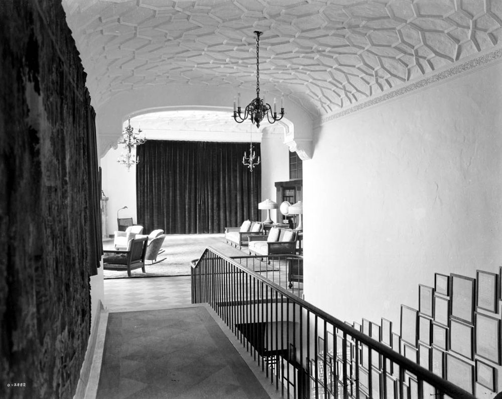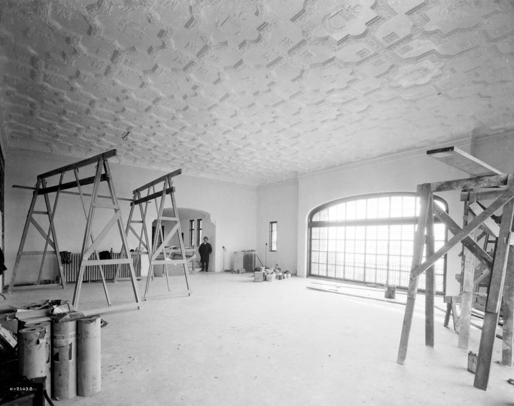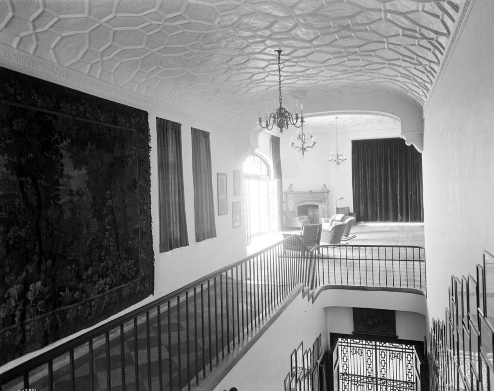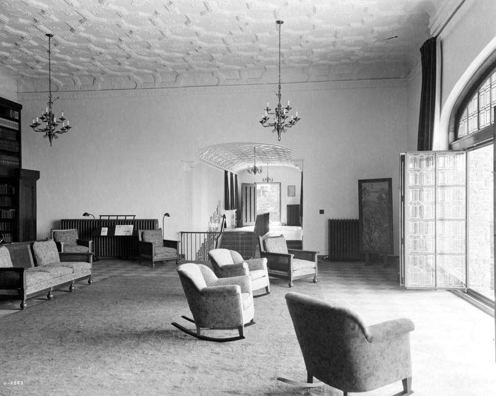 Unfortunately, the library was the room most impacted by a poorly engineered, leaky roof. This caused irreparable damage to the beautifully sculptured plaster ceiling with its royal crests. Whole chunks of plaster hung down or were missing, and tiny “snowflakes” fell constantly.